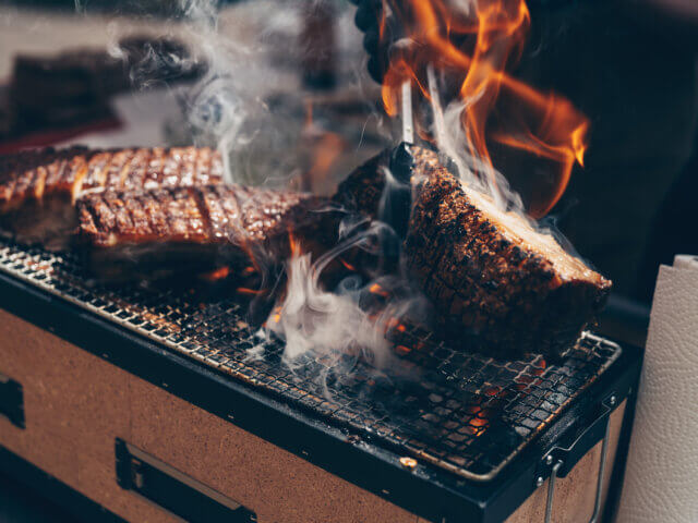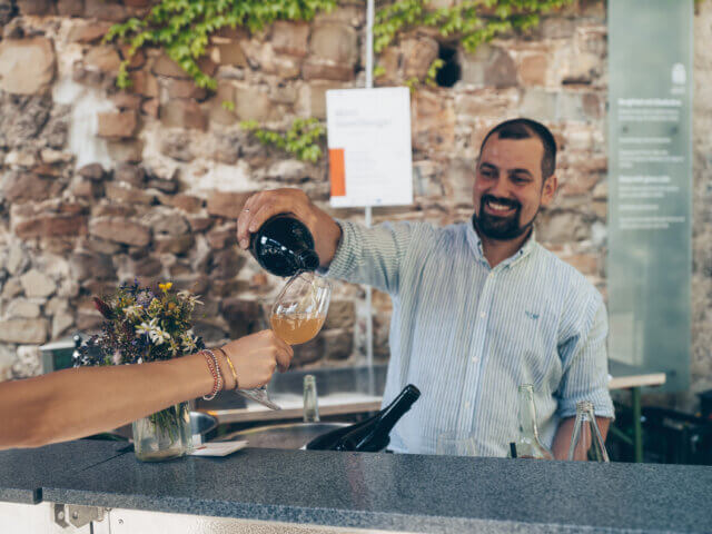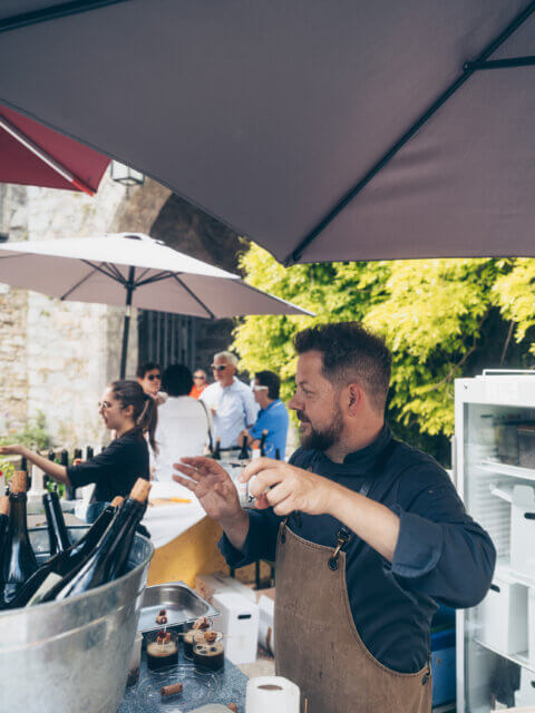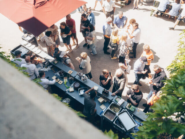 Alle Gründungsmitglieder sind beim Event dabei. Vor dem Eingang zum Schlosshof hat sich Mike Nährer positioniert, ein kerniger Haubenkoch, der schon im Taubenkobel und beim französischen Michelin-Waldschrat Marc Veyrat kochte. Mit mokkabrauner Schürze und verspiegelter Sonnenbrille steht er am Holzkohlegrill. Seine „knusprige Sau“ stellt sich als verdammt leckeres Schweinebauch-Roggen-Sandwich heraus, die leicht marinierten Radieschen darin stammen vom Maria Jeutendorfer Biobetrieb „Grünzeug vom Feld“. „Bei Street Food geht es nicht darum, ob etwas dehydriert ist oder fermentiert, sondern: Mund auf und schmecken soll es“, so Mike. Dazu Espresso Martini und Weine seines Zweitprojekts „Vergessene Gärten“.