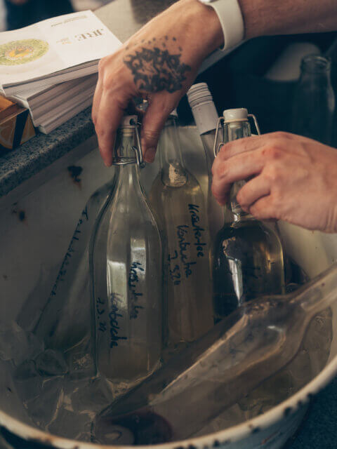 Auf zum nächste Stand: Hier schenkt Doris Farthofer einen „Bottled Cocktail“ mit O-Gin, Thymian und Birnensaft aus. „Mutig, gewagt, experimentierfreudig“, so beschreibt sie die Essenz der Feldversuche. Passt auch zu Andreas Plapperts begleitenden Flusskrebsravioli mit Grünspargel und Kräuternage und den Kutteln mit Salatherz und rauchiger Dottercreme.