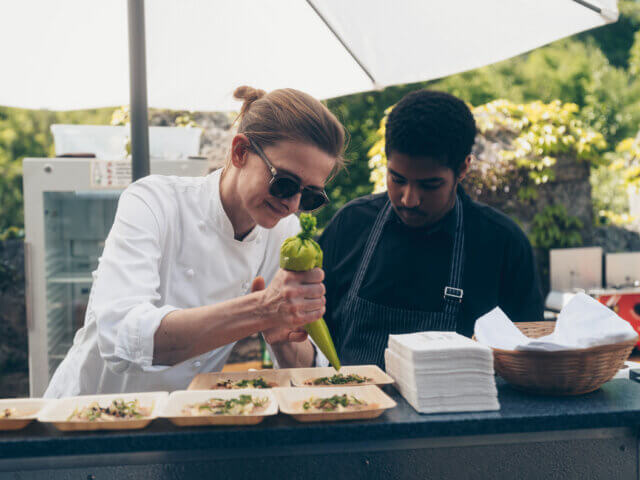 Derart gestärkt geht es weiter zum im Schlossschatten gelegenen Gasthaus-zur-Palme-Stand. Hier hat Theresia Palmetzhofer das Kommando, und was für eines: kühlende Forellen-Ceviche mit Apfelessig und Emmerkornreis und ein vegetarischer Sellerie-Burger. „Elan und Energie“ lautet ihre Gebrauchsanweisung für die diesjährigen Feldversuche.